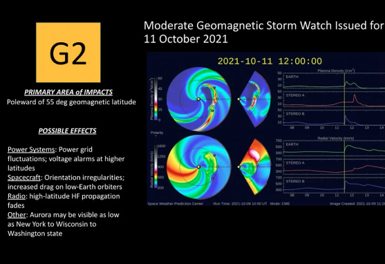 Se espera que hoy, 11 de octubre de 2021, llegue una eyección de masa coronal a la Tierra, con tormentas geomagnéticas de leves a moderadas, lo que resultará en una mayor actividad de auroras.