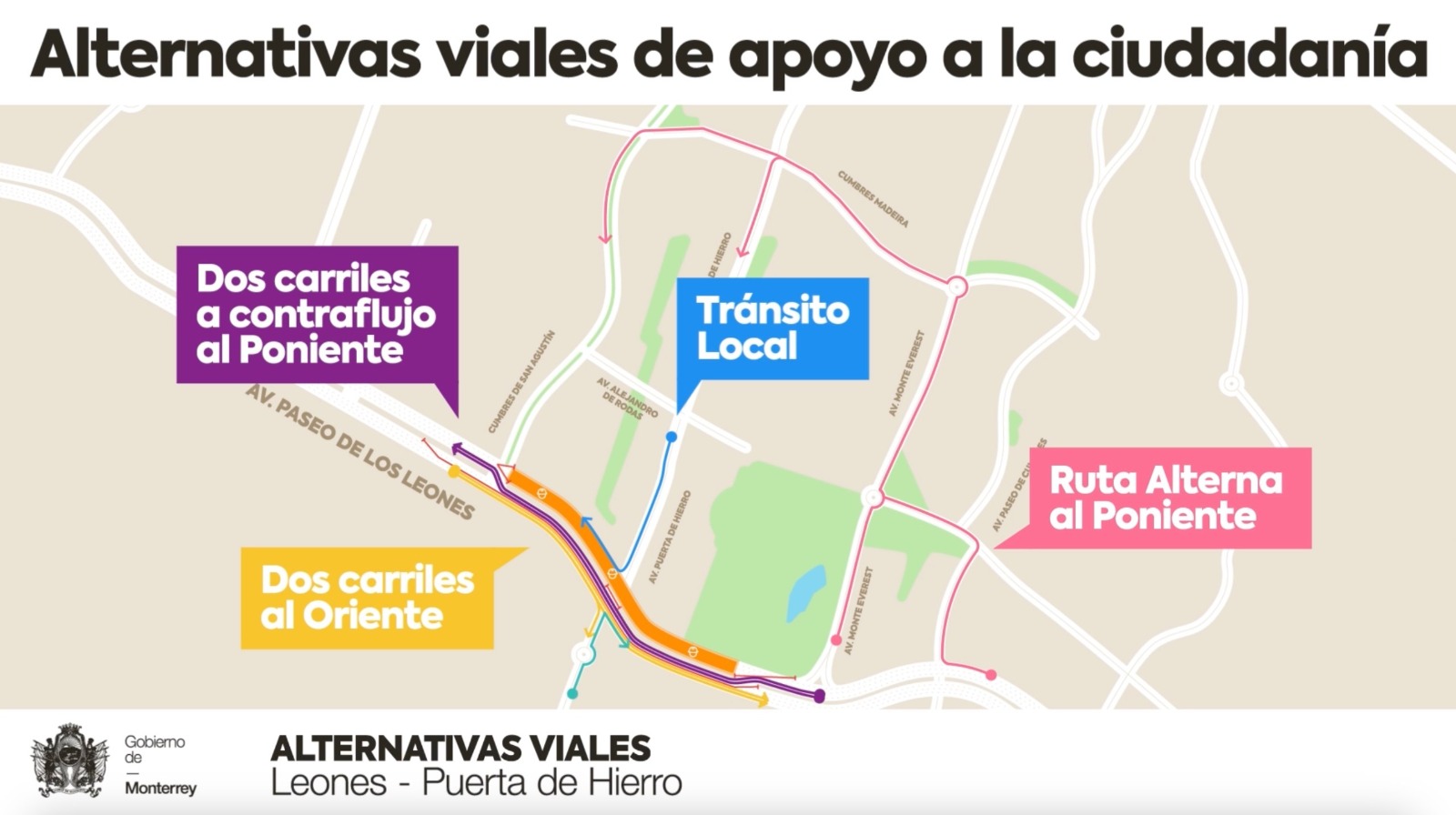 Por el avance en la construcción del paso a desnivel en Paseo de los Leones y Puerta de Hierro, el Gobierno de Monterrey implementará nuevas alternativas viales a partir de este miércoles 1 de mayo.