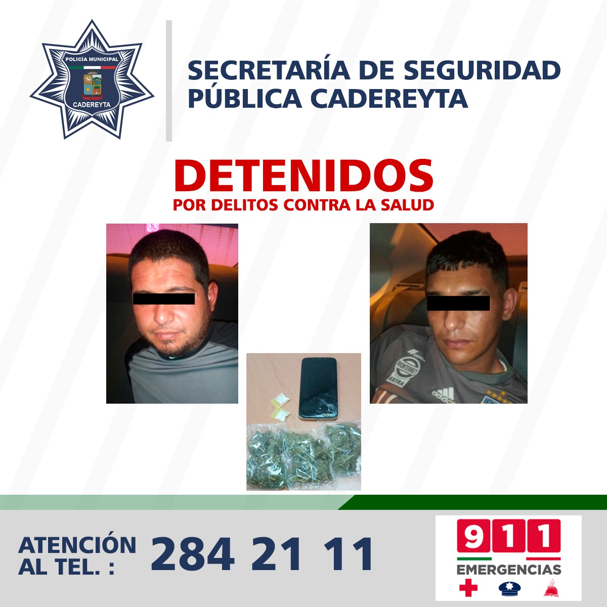 Los detenidos la noche del domingo 6 de septiembre, Jesús G. de 23 años de edad y Daniel G. de 36 años ambos originarios de Cadereyta, fueron puestos a disposición del CODE para sus declaraciones correspondientes.
