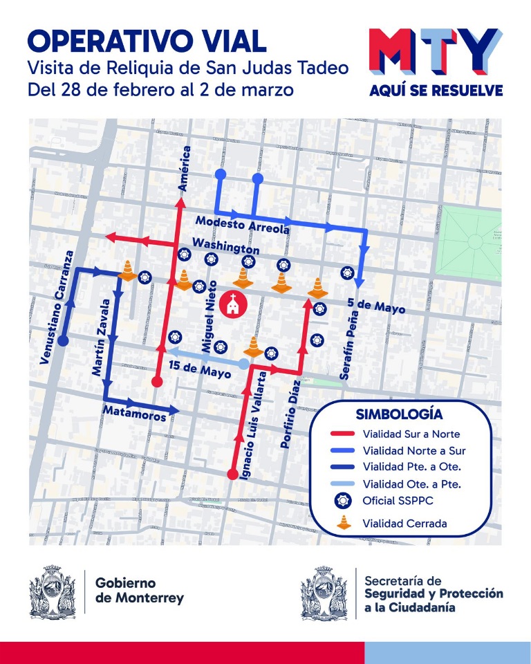 Para brindar seguridad a los asistentes y agilizar la vialidad en la zona del Santuario de San Judas Tadeo, la Secretaría de Seguridad y Protección a la Ciudadanía de Monterrey implementará un operativo desde hoy.