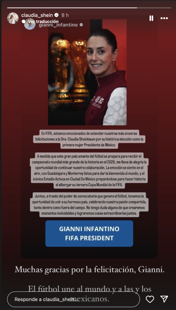 “Muchas gracias por la felicitación, Gianni. El fútbol une al mundo y a las y los mexicanos”, respondió la candidata electa a través de una historia en la red social Instagram.