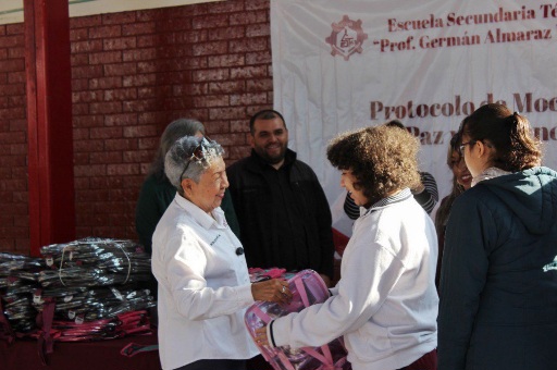 La diputada local de Morena, Reyna Reyes, entregó más de 289 mochilas transparentes a estudiantes de la Secundaria Técnica No. 63 “Profesor Germán Almaraz Villalobos”, en Juárez, como parte del Programa Estudiante Seguro.