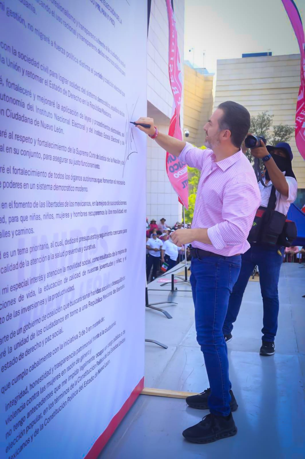 El candidato fue el primero en firmar el compromiso por la democracia ante miles de ciudadanos, que acudieron con vestimentas en color rosa y blanco y banderas y carteles alusivos a la manifestación, que se congregaron en la explanada del Museo de Historia Mexicana.