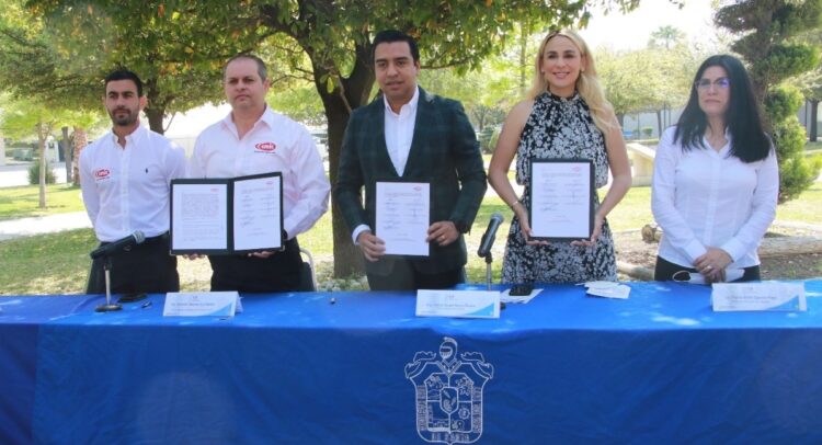 El Alcalde Jesús Nava Rivera; la presidenta del DIF Municipal, Paola García y el presidente de CMIC Nuevo León, Roberto Macías Quintanilla, firmaron el convenio, con el que también se busca mayor inversión en la industria de la construcción.