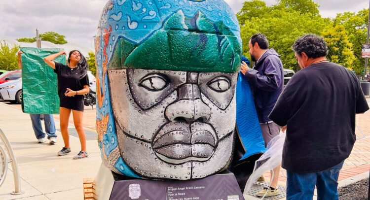 La exposición Olmec Trails muestra esculturas de gran escala pintadas a mano inspiradas en las icónicas cabezas olmecas. Esta exhibición que reunió las obras de 33 artistas contemporáneos de América del Norte, rindió homenaje a la herencia mexicana y la importancia del arte público.