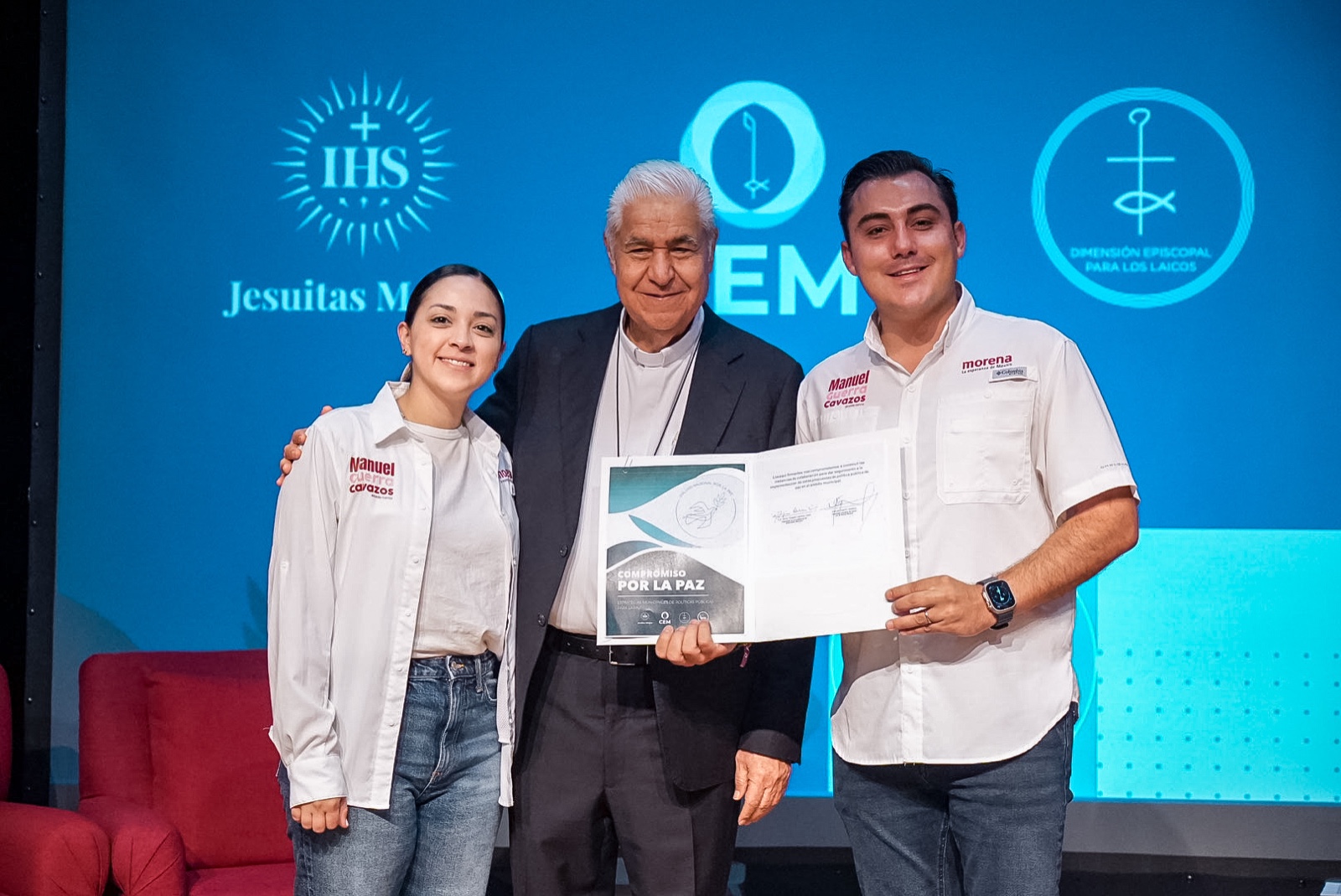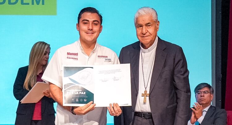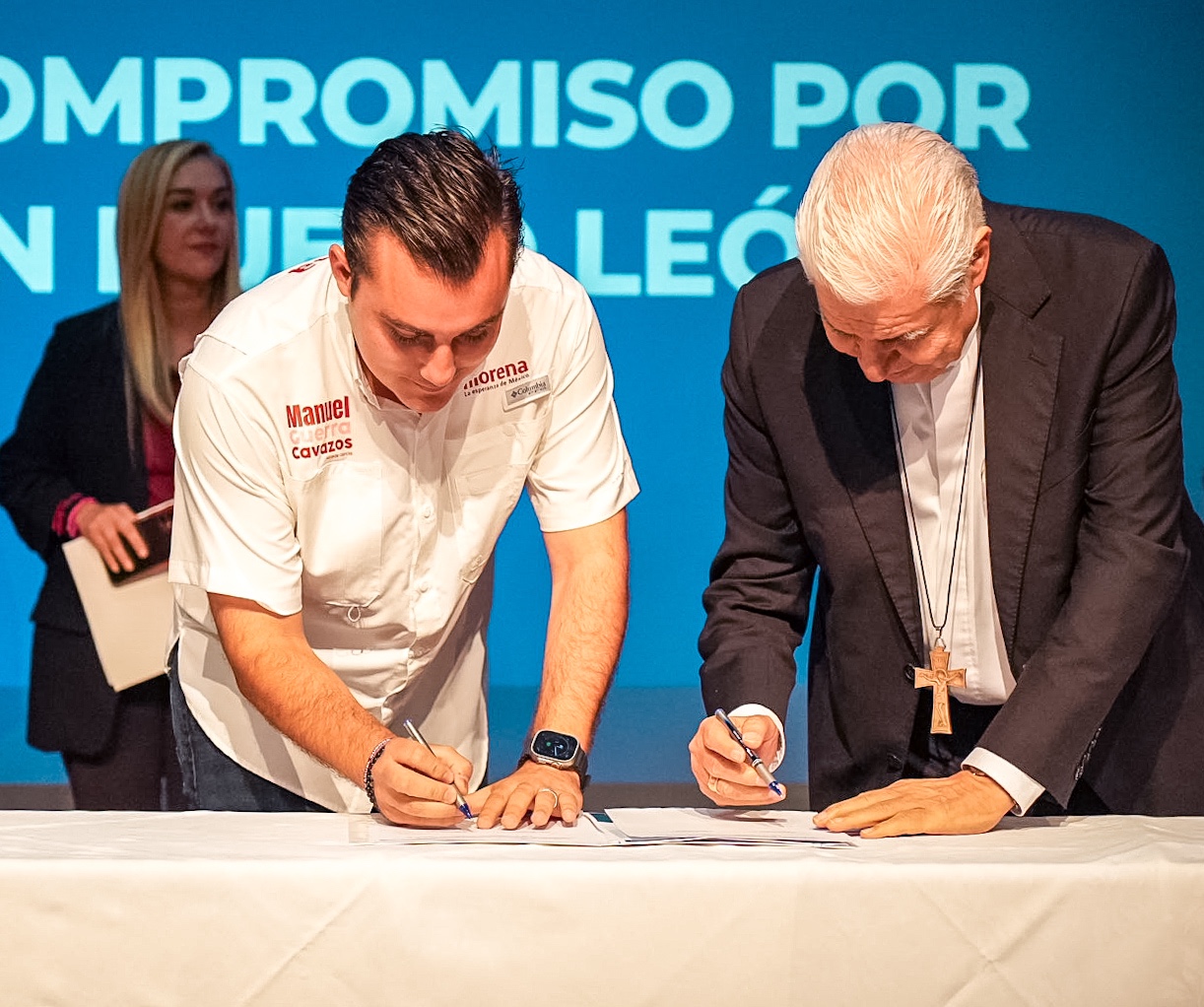 El candidato a la alcaldía de García, Manuel Guerra Cavazos, participó en el Diálogo Nacional por la Paz, donde firmó el Compromiso por la Paz en Nuevo León, evento encabezado por el Arzobispo de Monterrey y Presidente de la Conferencia del Episcopado Mexicano, Rogelio Cabrera López.