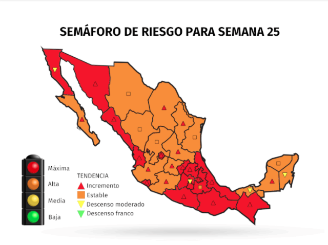 La Secretaría de Salud (SSa) dio a conocer un nuevo mapa semáforo por estados, donde 16 estados cambiaron su señalización de rojo a naranja mientras que las otras 16 entidades permanecen en rojo con peligro de máxima transmisión.