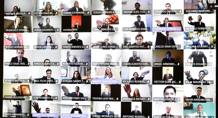 Los alumnos a un mismo tiempo levantaron la mano frente a la cámara de su computadora y protestaron de manera virtual frente al Comité de Titulación conformado por el M.C. Juan Ángel Garza Garza, la M.C. Nydia Esther Ramírez Escamilla, Coordinadora General de Gestión Social y el Dr. Homero Morales Carrillo, Secretario de Deportes de FIME.
