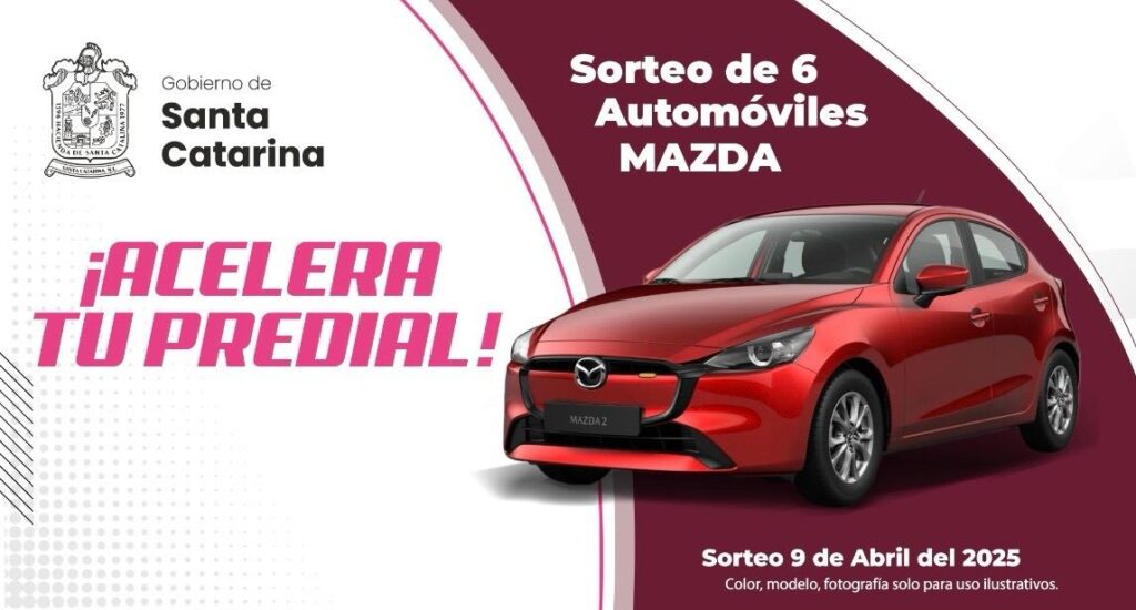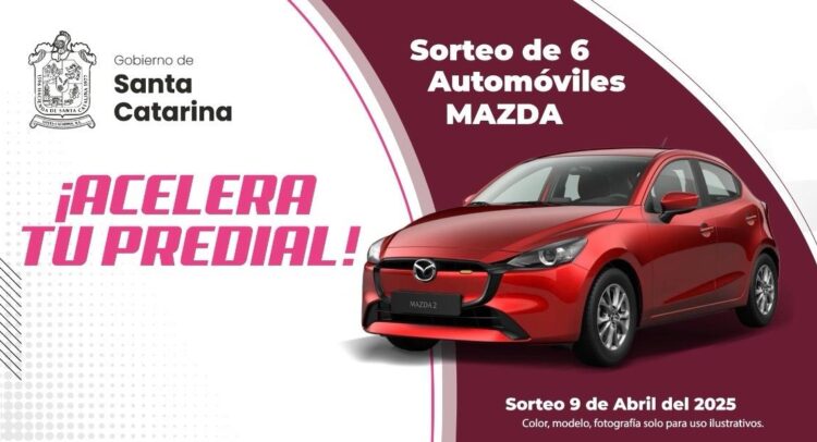 El Gobierno de Santa Catarina realizará la rifa de seis vehículos Mazda entre contribuyentes cumplidos en el pago del Impuesto Predial, esto durante los primeros tres meses de 2025.