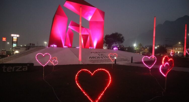El Alcalde Jesús Nava Rivera informó que sitios emblemáticos como el monumento a La Puerta de Monterrey, plazas públicas o camellones centrales de avenidas como Díaz Ordaz, fueron decorados con corazones gigantes, iluminados en rojo y rosa, a la vista de automovilistas y transeúntes.