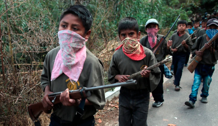 Con armas bajo custodia, uniformados con una camiseta de la policía comunitaria, cubiertos del rostro y un miedo que se refleja en su mirada, los menores se encargan de la seguridad, junto con los adultos, en su pueblo.