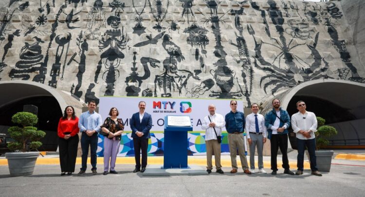 En un esfuerzo conjunto para mejorar la movilidad metropolitana y embellecer el espacio público, el alcalde de Monterrey, Adrián de la Garza, y su homólogo de San Pedro Garza García, Mauricio Fernández Garza, inauguraron este martes el mural “Ojo de Agua”, ubicado al interior del túnel Agustín Basave, en ambos sentidos, una de las principales vías de conexión entre las dos ciudades.